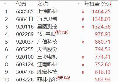 个股层面表现同样惊人。924行情启动以来,全市场有多达5200只个股上涨,仅229只个股下跌。其中,3089只个股上涨幅度超过50%,2272只个股上涨超过70%,1489只个股涨幅达到100%及以上。424只个股涨幅超200%,159只个股涨幅超过300%,83只个股涨幅超400%,35只个股涨幅超500%。位列前三的牛股涨幅均超过1000%,分别是上纬新材、海博思创、星图测控,涨幅分别高达1476%、1348%、1324%。