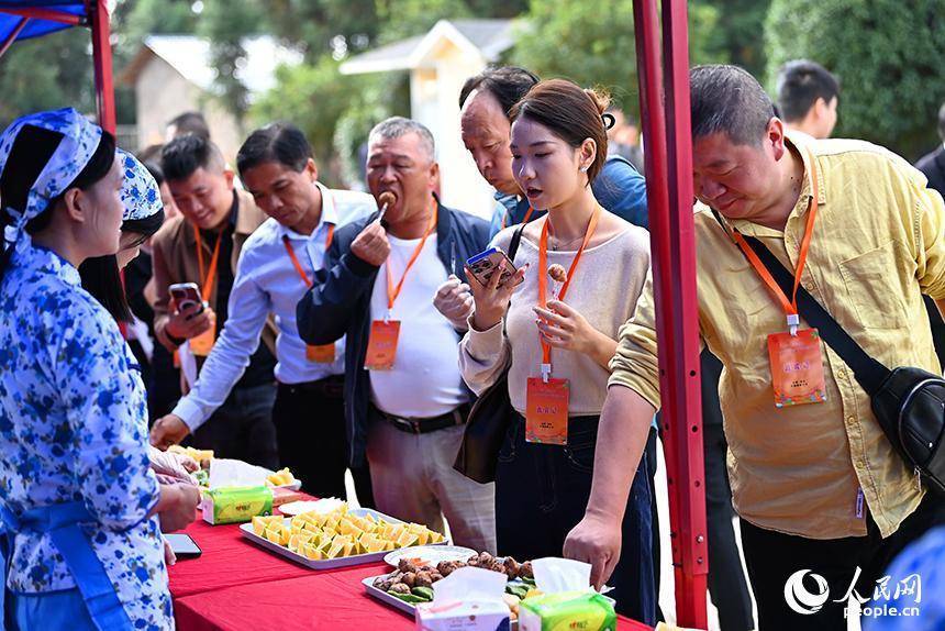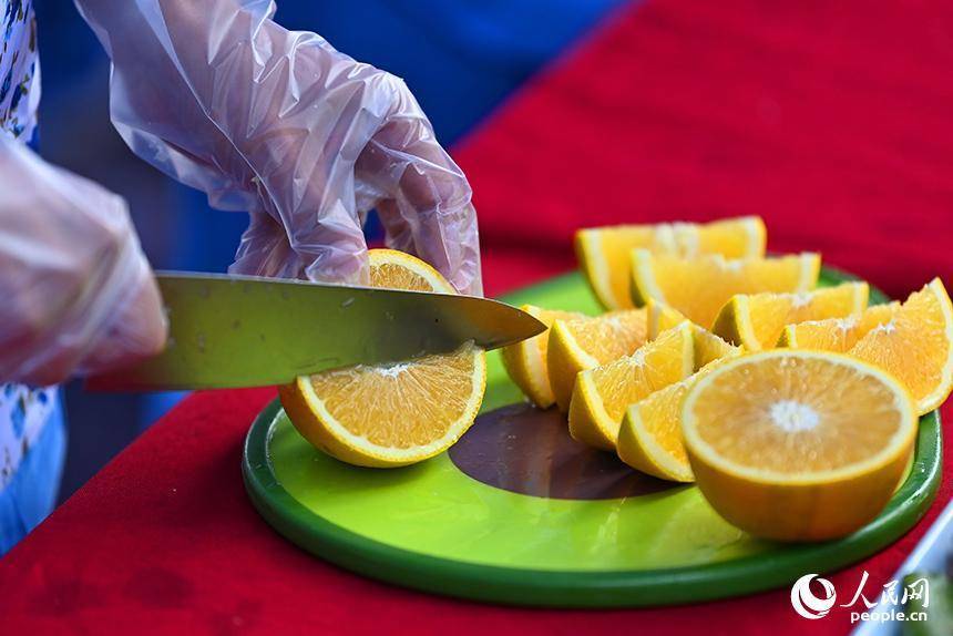 采购商和游客前来洽谈脐橙订单,品尝脐橙特色美食。人民网 朱海鹏摄