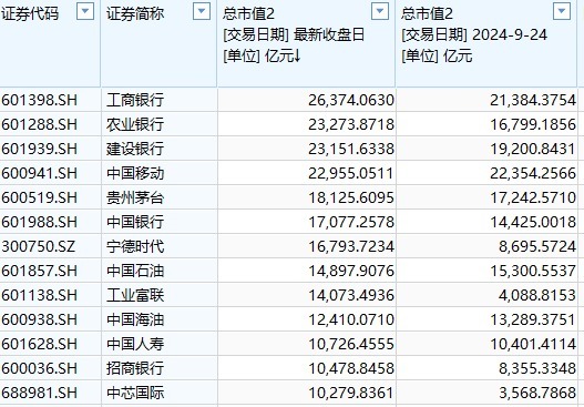 去年9月24日收盘,A股市值超万亿的上市公司为9家,按照排名分别为中国移动、工商银行、建设银行、贵州茅台、农业银行、中国石油、中国银行、中国海油、中国人寿。