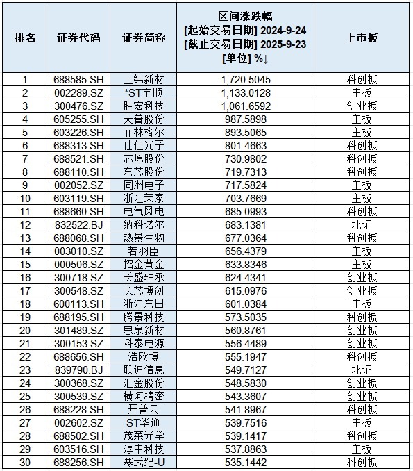 有三只牛股区间涨幅超1000%,领跑本轮行情,分别为上纬新材、*ST宇顺以及胜宏科技,涨幅分别高达1720.50%、1133.01%、1061.66%。
