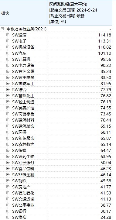 数据显示,自“924”行情以来,31个申万一级行业涨跌幅平均值均为正值,意味着在板块轮动下,市场呈现普涨态势。但对比可以看出,各板块涨幅差异较为明显。