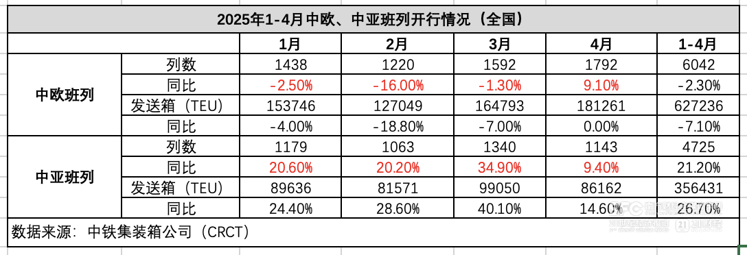 从数据上看,1-4月,全国累计开行中欧班列6042列,同比下降2.3%,其中去程2820列,同比下降18.2%,回程3222列,同比上升17.8%。同期,中欧班列累计发送货物627236标箱,同比下降7.1%,其中去程292925标箱,同比下降22.1%,回程334311标箱,同比上升11.7%。整体来看,中欧班列出口业务整体呈现下降态势。